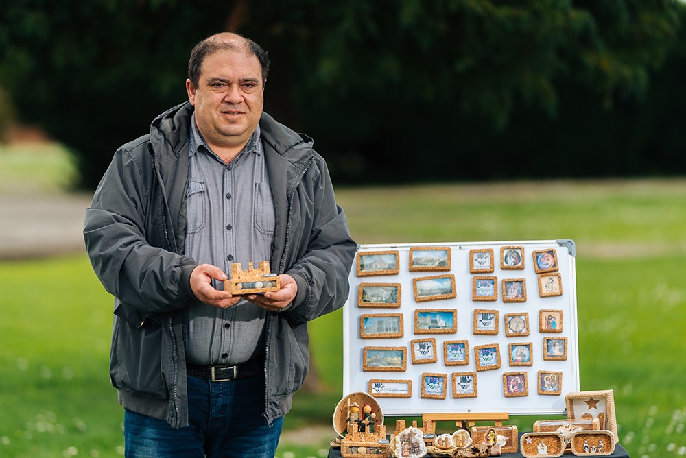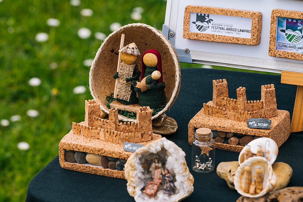 Trabalhos em cortiça, pedra e merchandising.