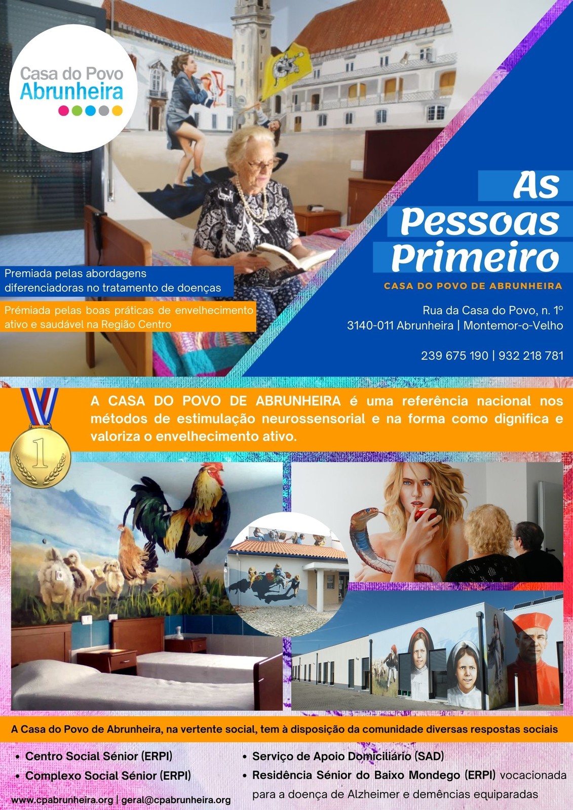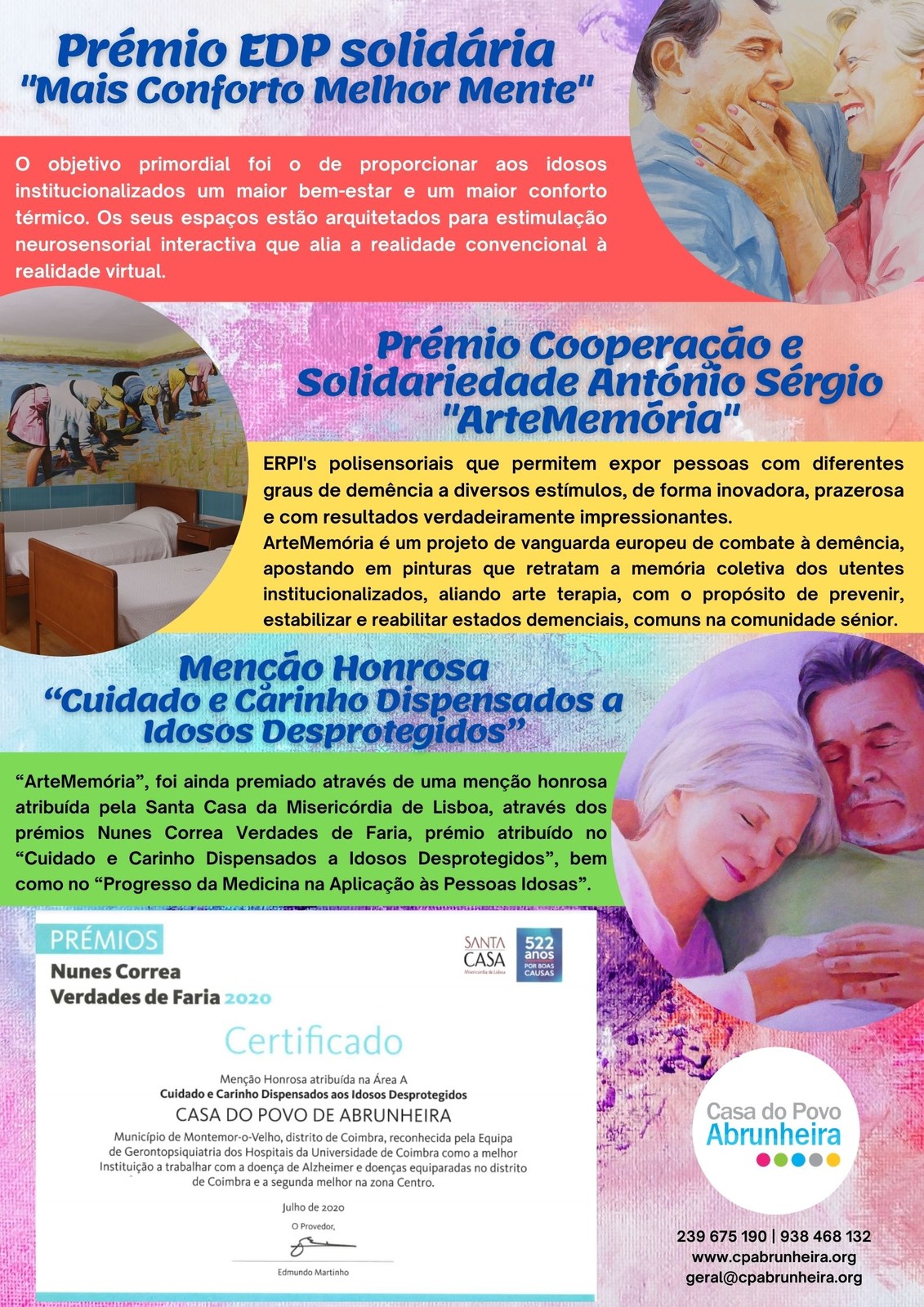 ArteMemória é um brilhante exemplo, tendo sido galardoado com o Prémio Ajudar 2018 da Fundação INATEL. Este projeto recorre a pinturas em grande escala, espalhadas por vários espaços da instituição, com o objetivo intrínseco de estabilizar, reabilitar e prevenir estados demenciais.