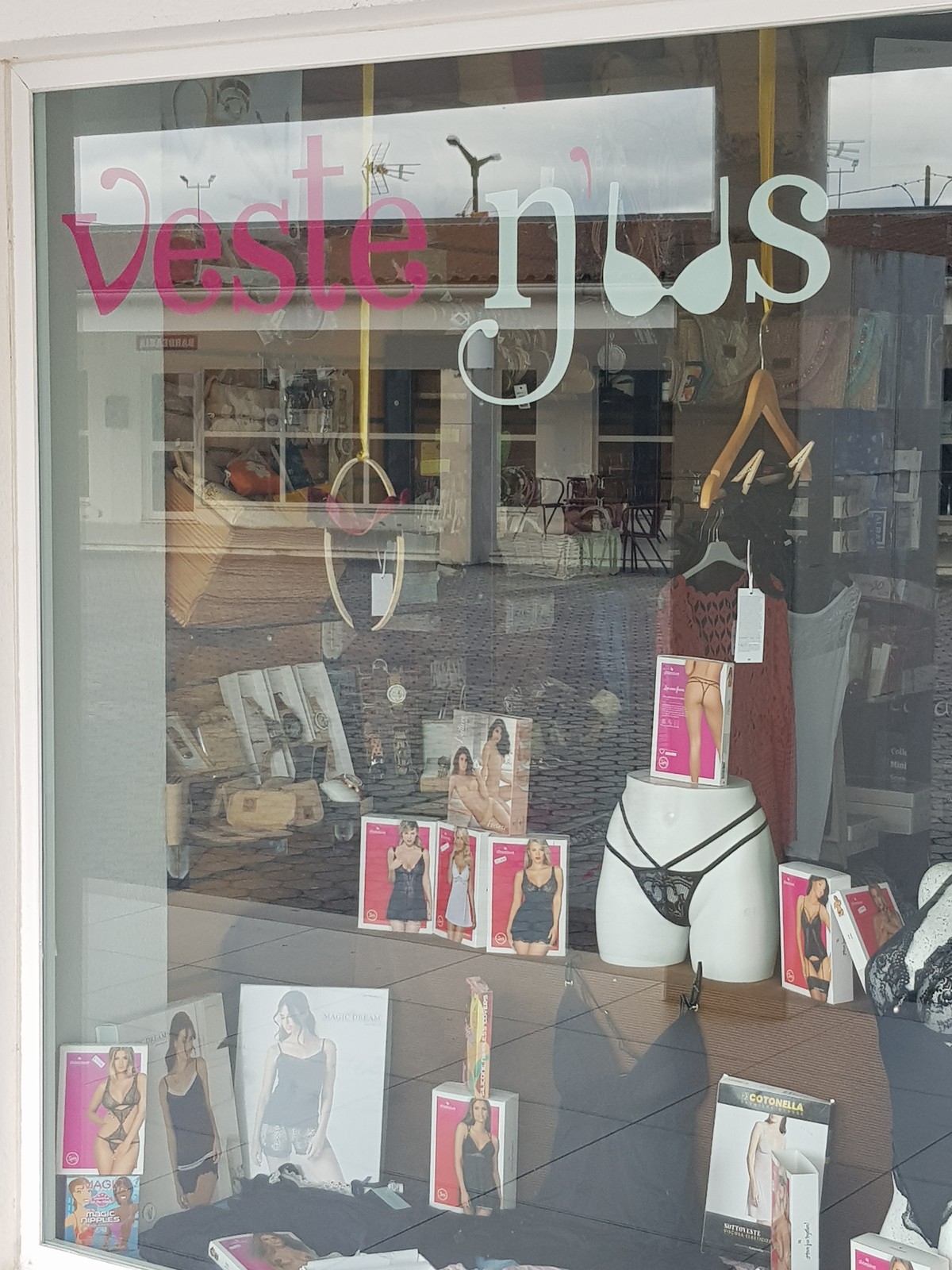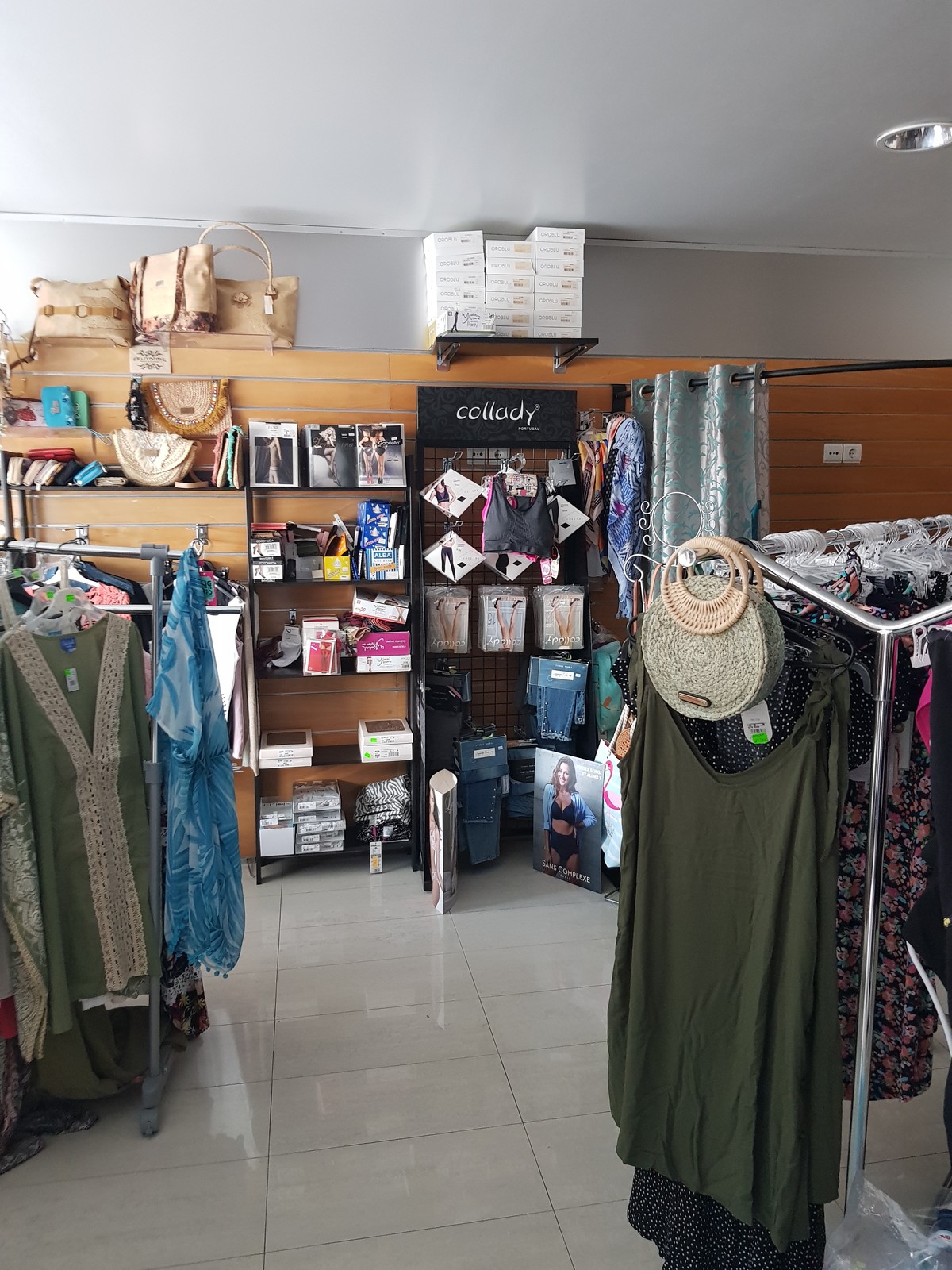 Comércio de artigos de vestuário, nomeadamente lingerie, biquínis, roupa de praia, acessórios de cabelo, bijuteria, leggings, chinelos de quarto e soluções (copas de colar) para vestidos de cerimónia, collants e camisolas 2ª pele (inverno).