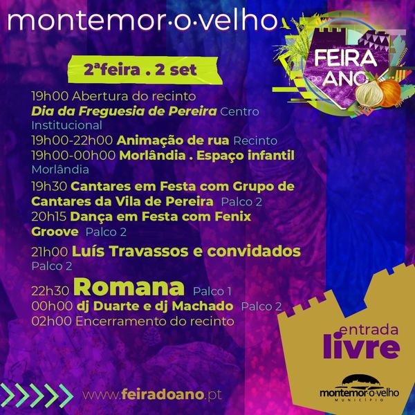 Na 2ª feira, dia 2 de setembro, a partir das 19h30, há cantares e danças em festa, às 21h, acontece o espetáculo com Luís Travassos e convidados e, às 22h, a animação continua com Romana.